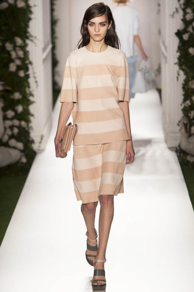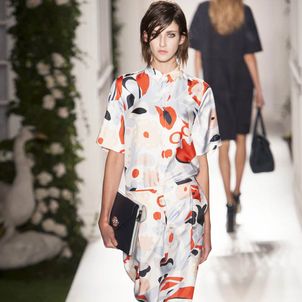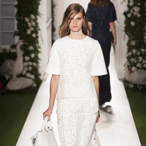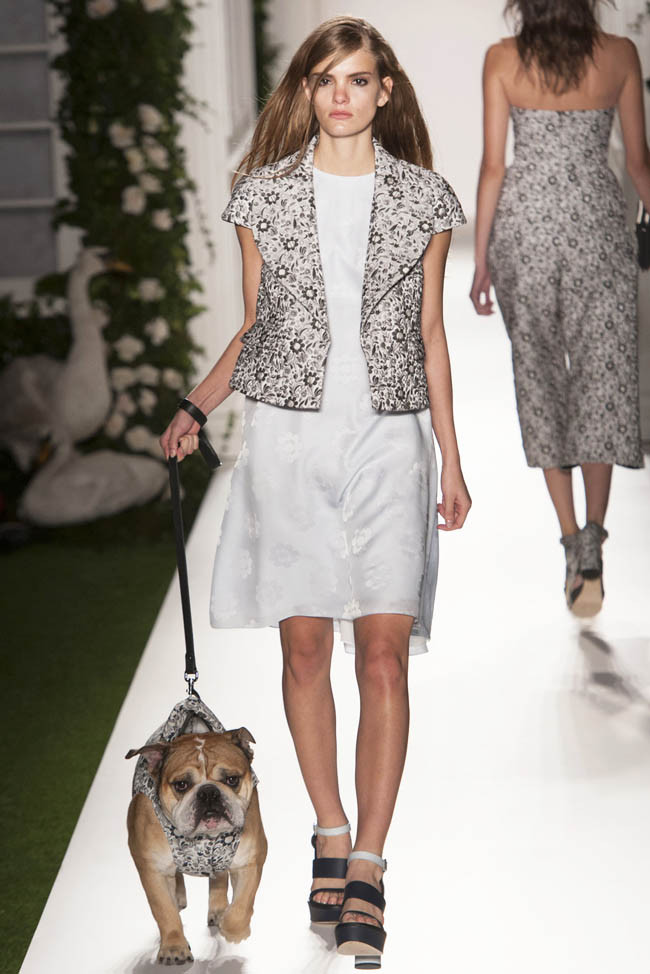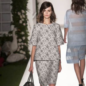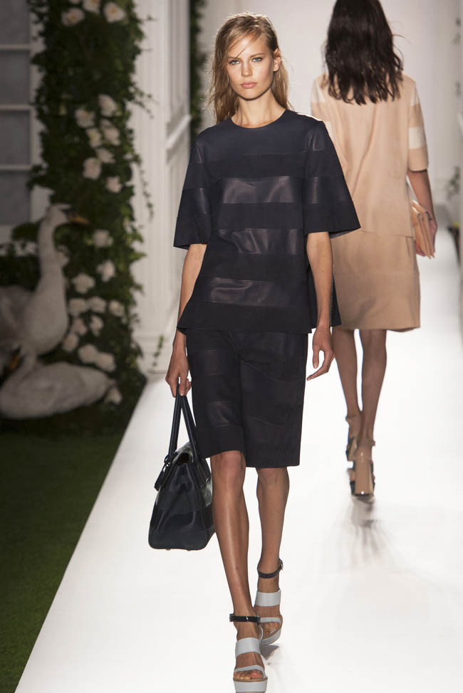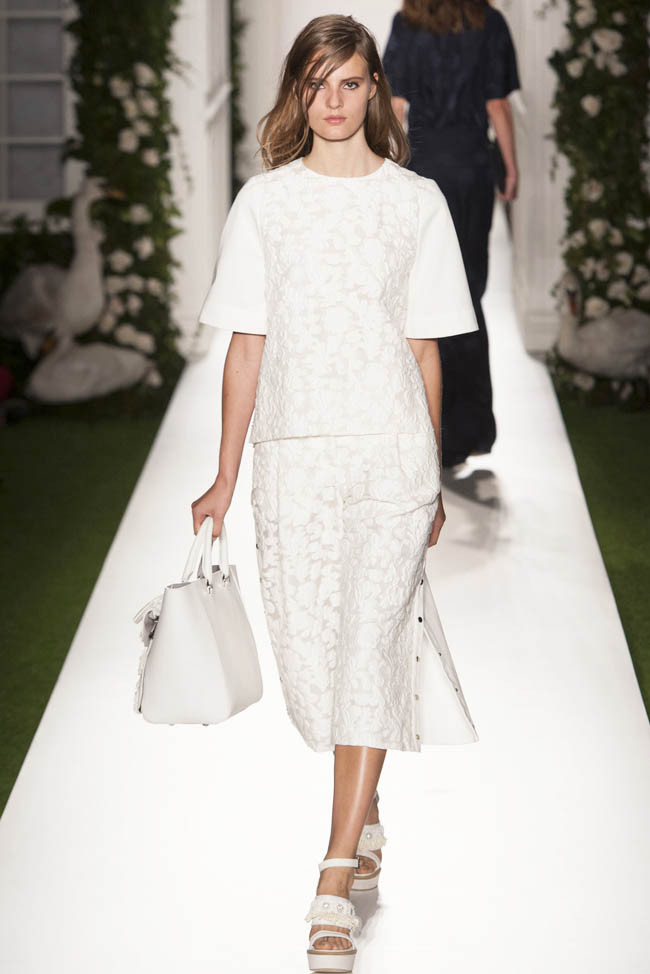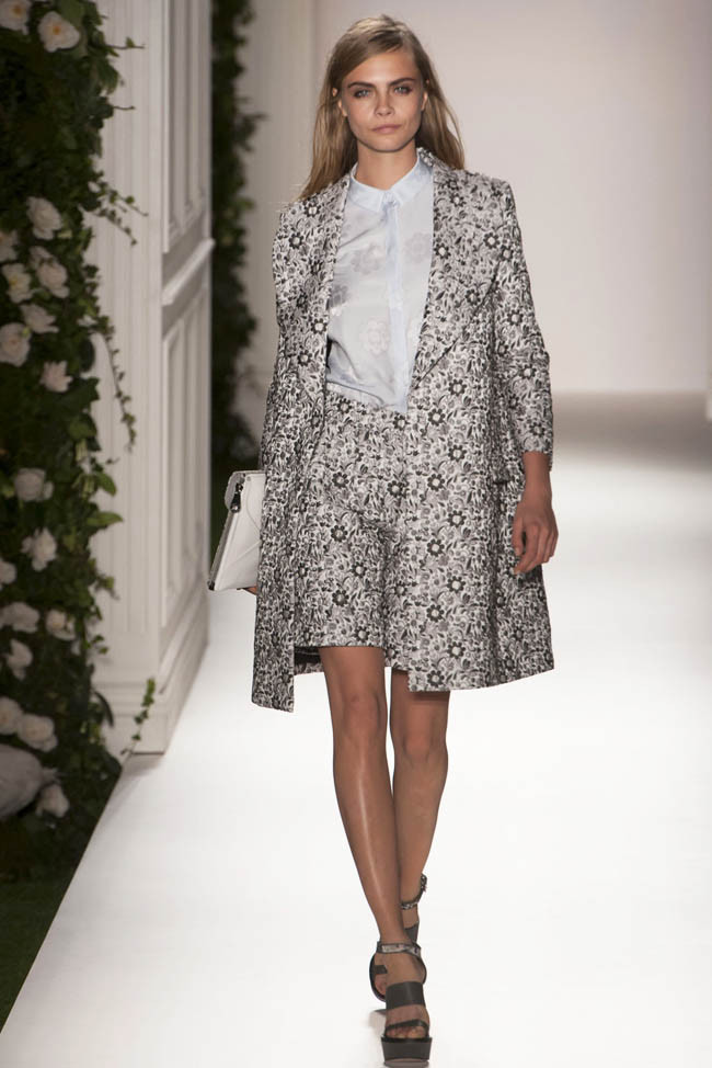 After six years at helm of Mulberry, creative director Emma Hill presented her final collection for the brand’s spring 2014 runway show at London Fashion Week. The outing was elegant yet practical with a color palette of basic black and white infused with touches of red, nude and blue. Hill celebrated inherently English themes such as tea parties, estate gardens and even bull dogs with her playfully demure looks.