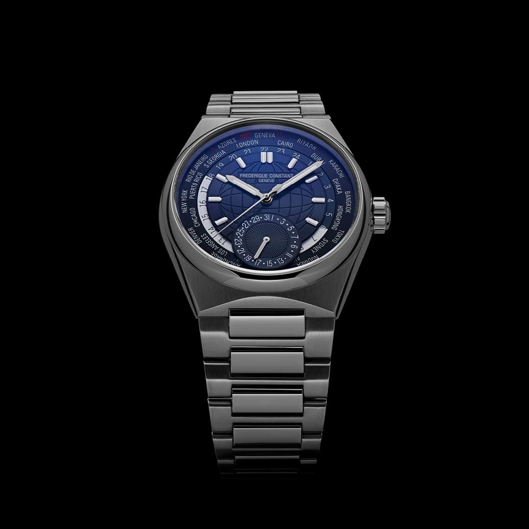 The highly contemporary design of the Frederique Constant Highlife Worldtimer Manufacture 41 mm steel case and dial with globe engraving is an ode to travel.