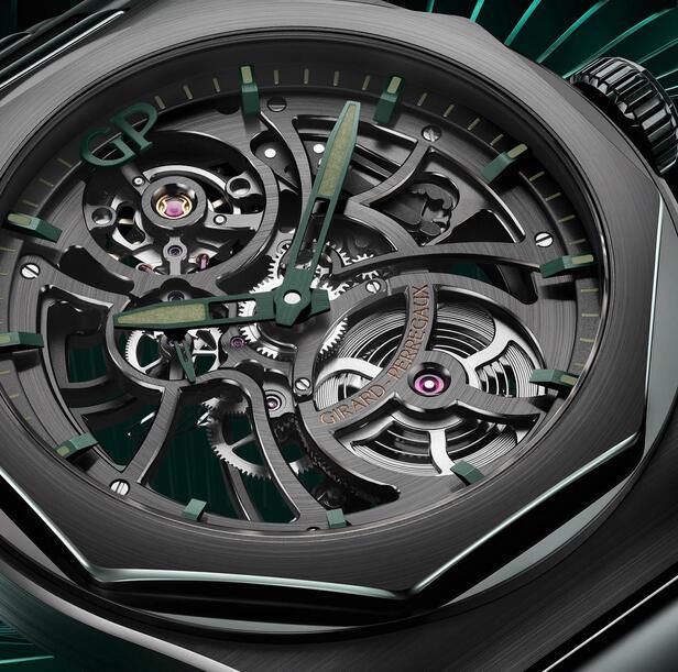 The true drama of this timepiece, however, lies in its transparency. Unlike traditional watches that hide their secrets behind closed dials, the Laureato Skeleton Aston Martin Edition offers an uncompromising view of its expertise through a dramatic openworked structure. The in-house GP01800 calibre is revealed in all its architectural glory, featuring a black PVD-treated mainplate and bridges that have been meticulously finished by hand. The movement showcases 55 hand-crafted internal angles which serves as a testament to true watchmaking artistry.
