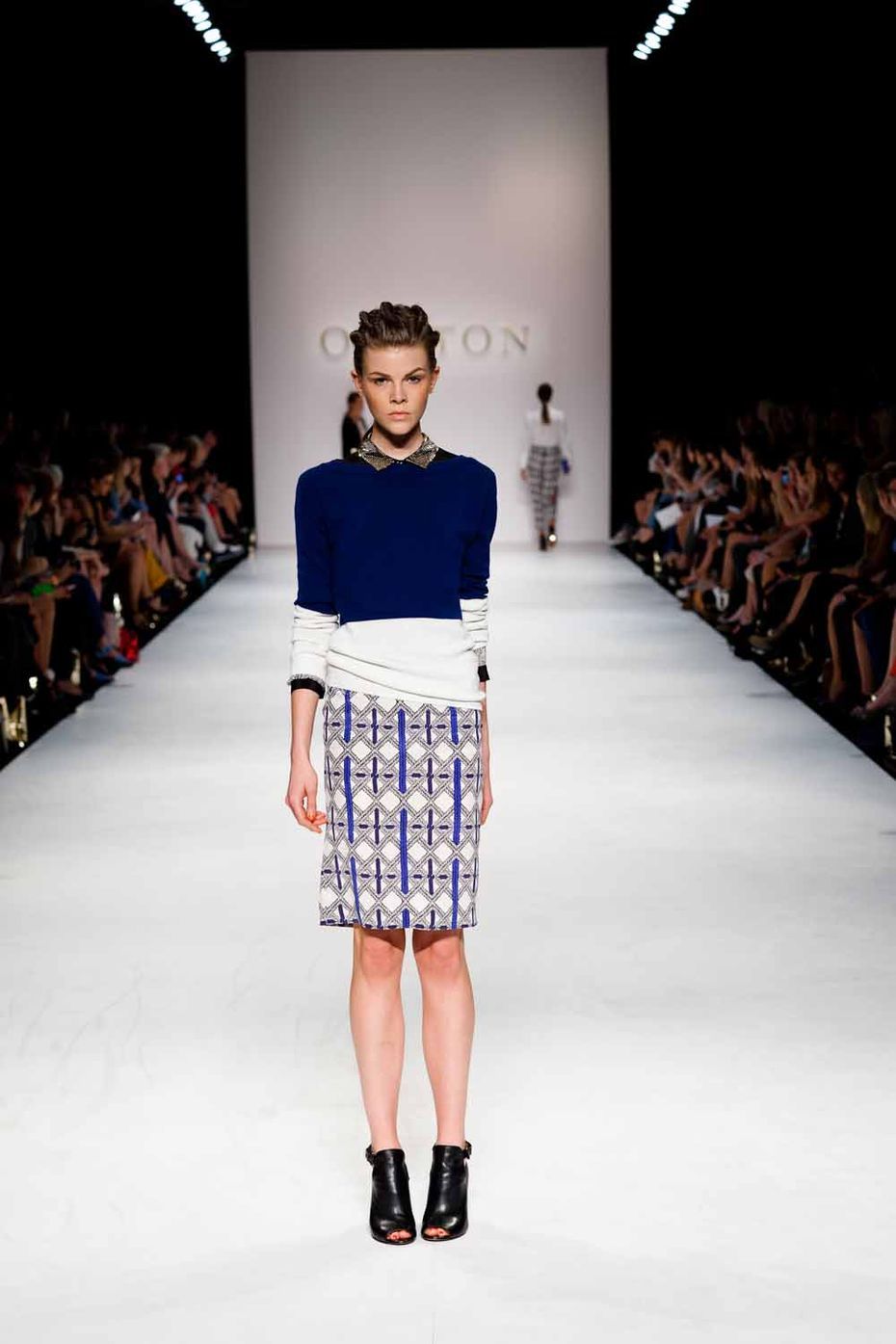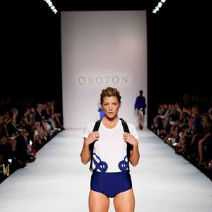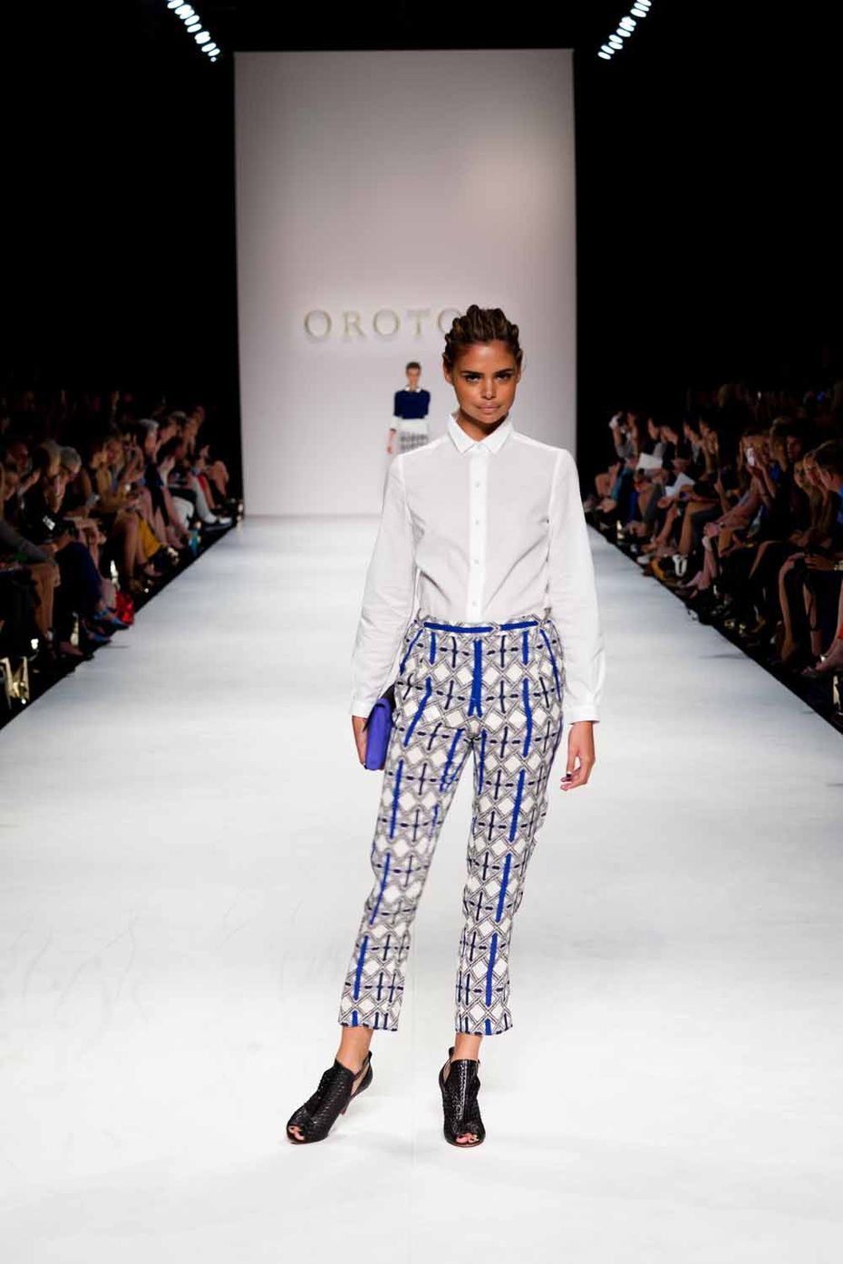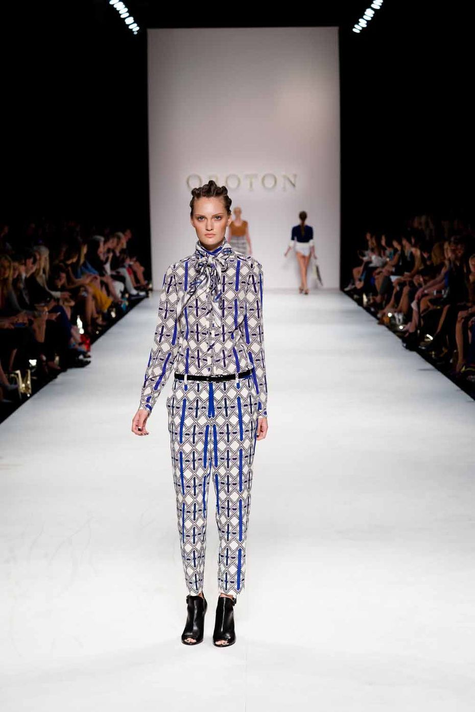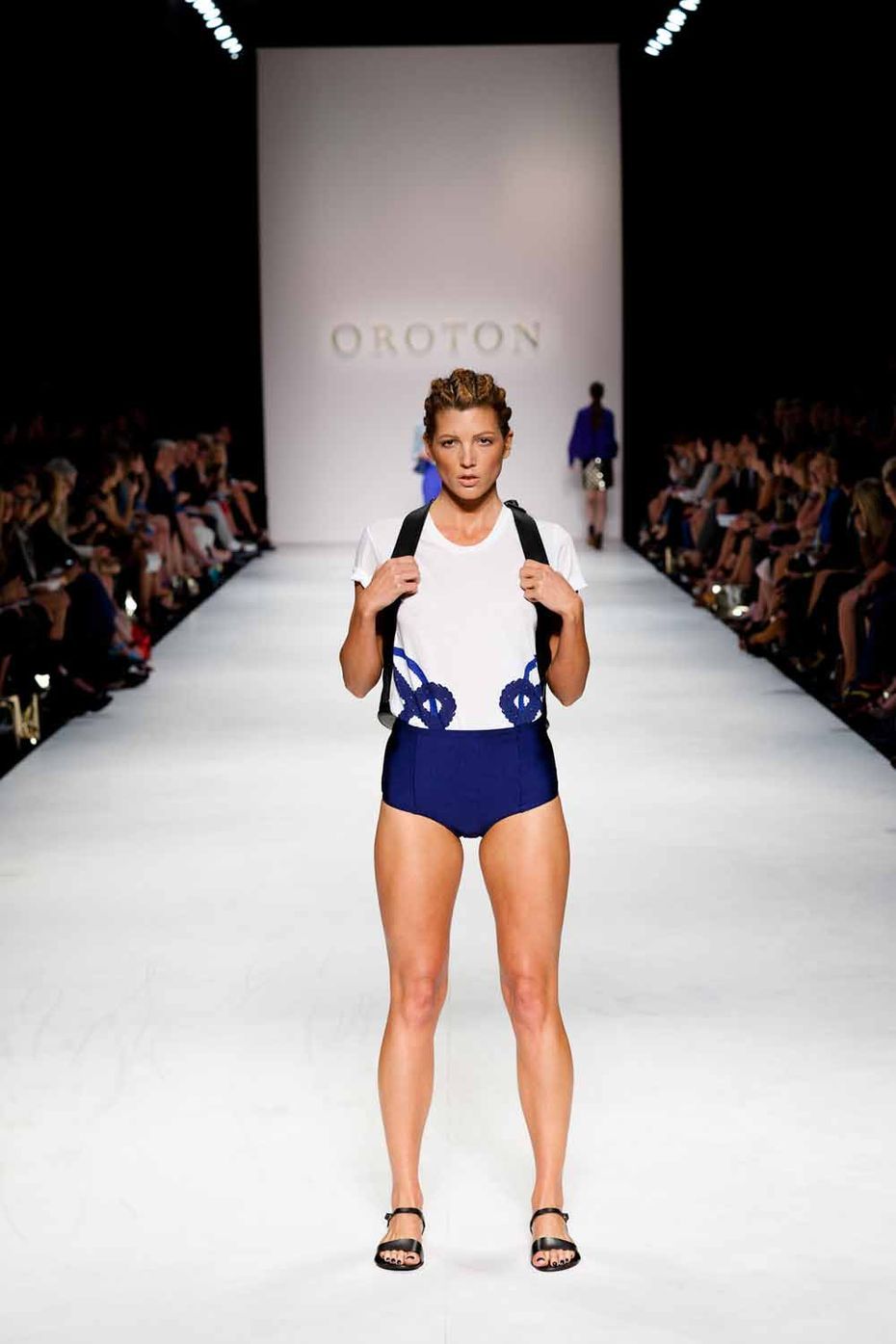 The face of Oroton’s current campaign, Samantha Harris, opened the show wearing an eye-catching silk ensemble featuring the collection’s hero plaited rope print in electric blue.