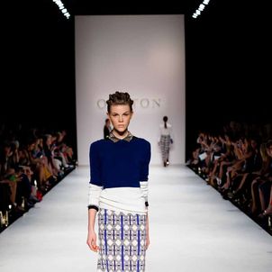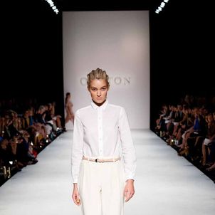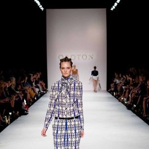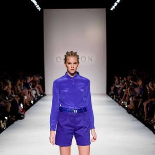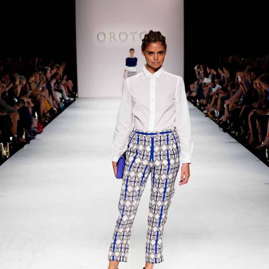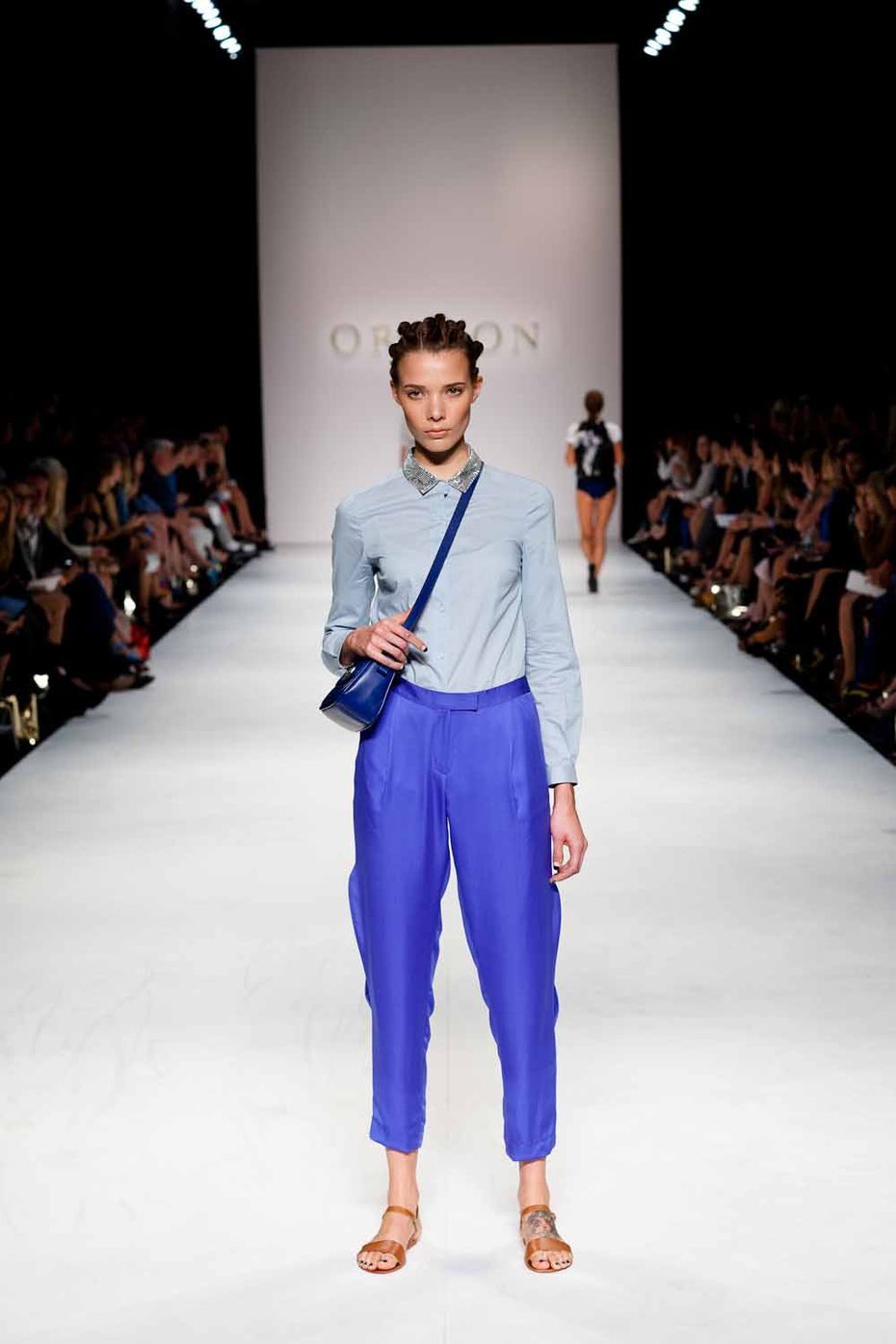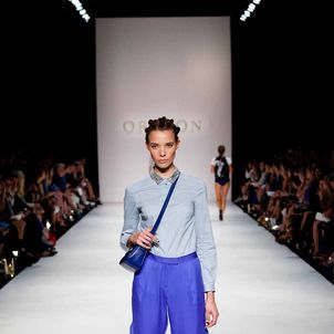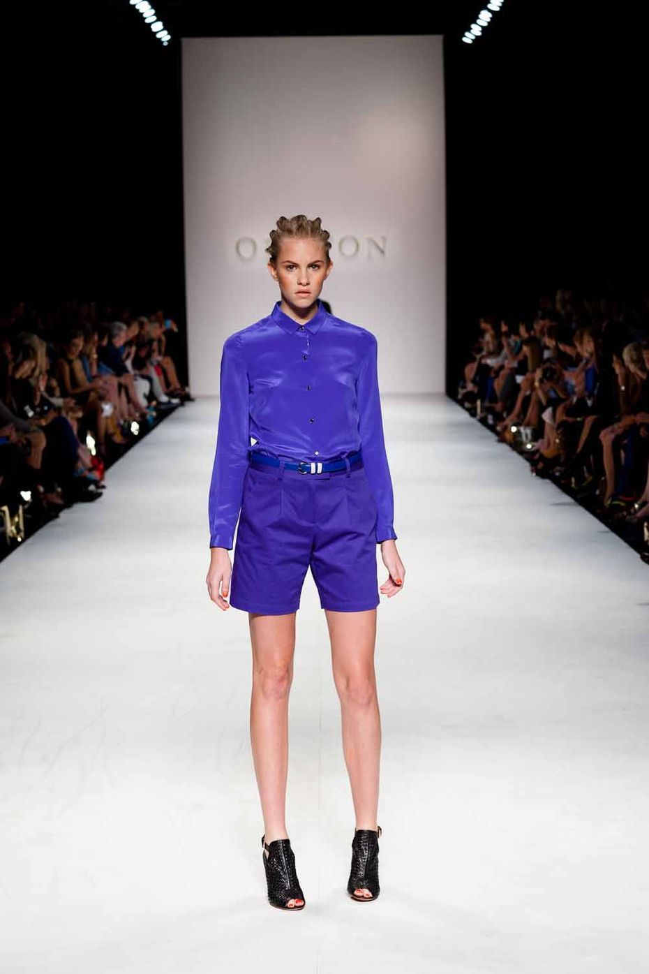 The face of Oroton’s current campaign, Samantha Harris, opened the show wearing an eye-catching silk ensemble featuring the collection’s hero plaited rope print in electric blue.