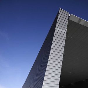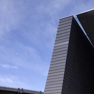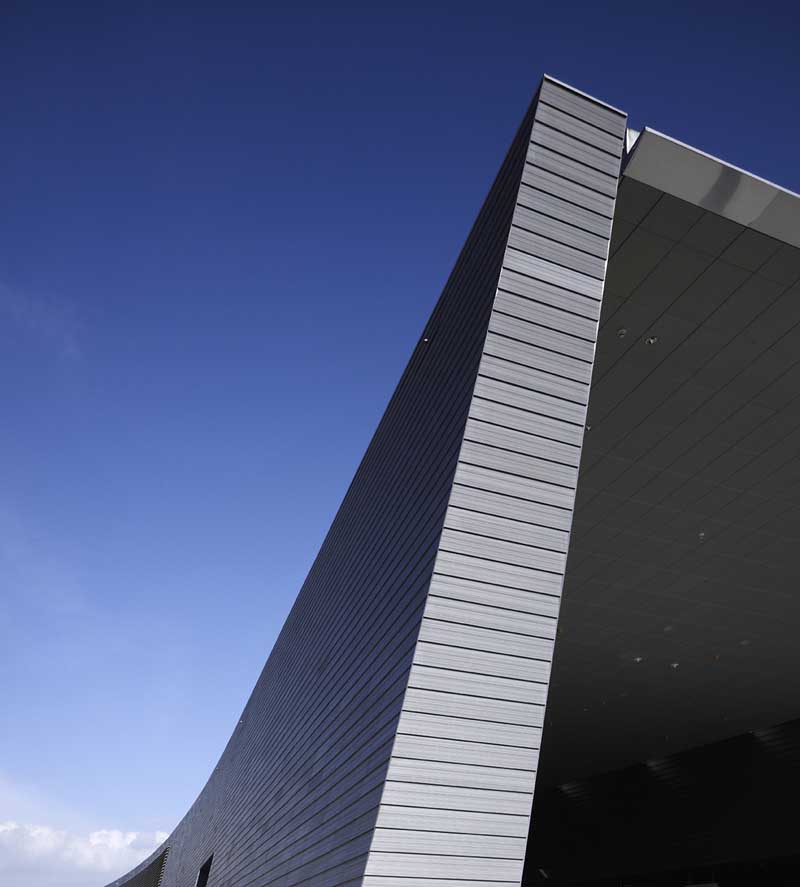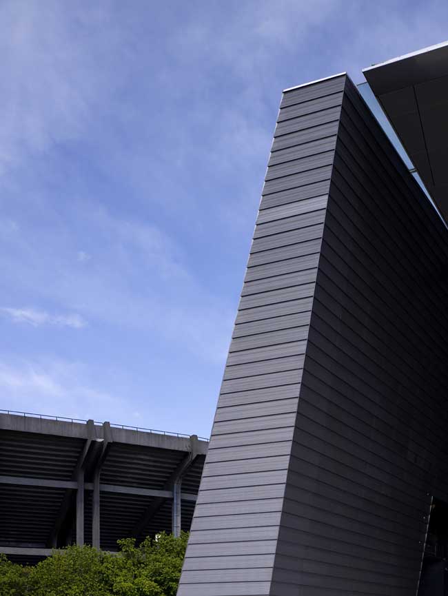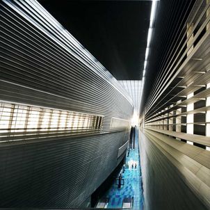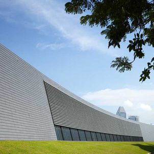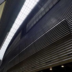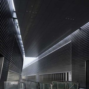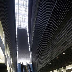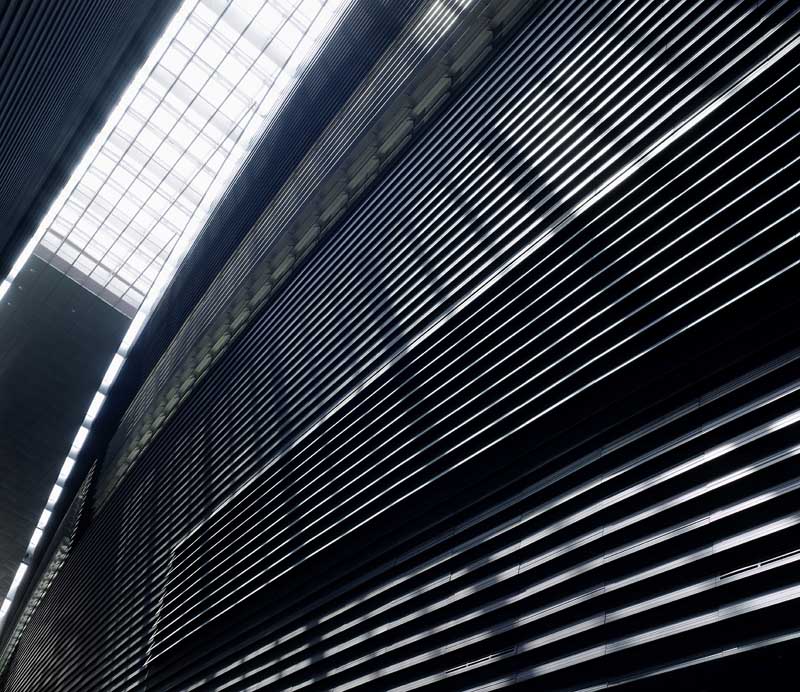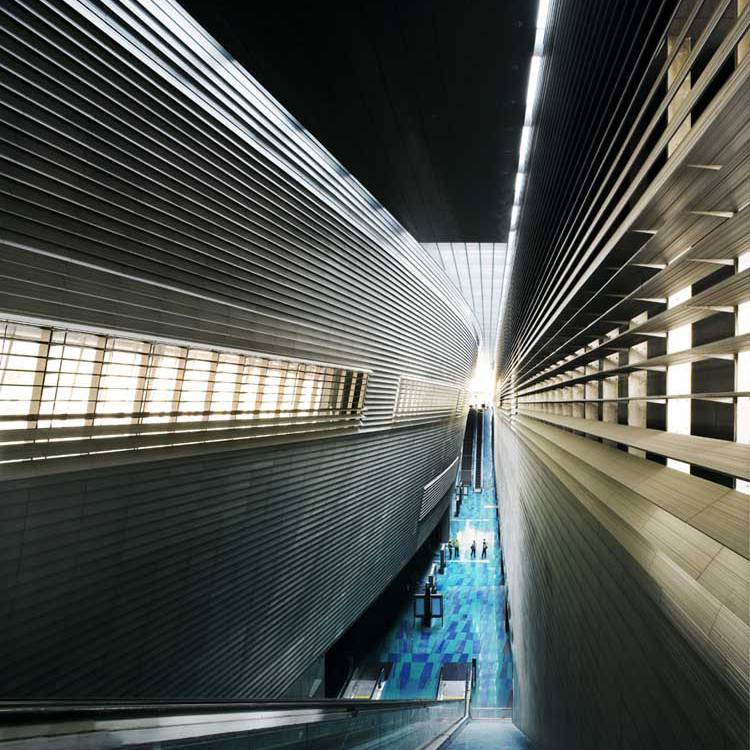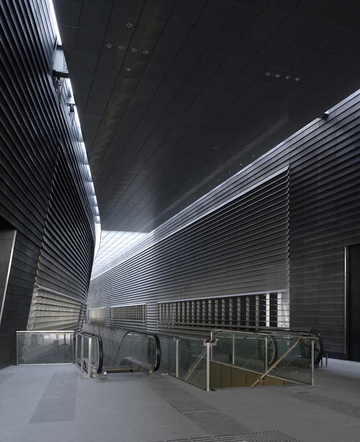 The station creates a major dramatic space that gives the public a moment of spatial grandeur in their daily commute, as traditional train stations in Europe do. A central skylight creates an attractive, day-lit platform. Openings in the above-ground forms allow views down to the platform from the ground level plaza. The ribbed aluminium cladding system was custom designed by the architects to create an ambiguous material, sometimes soft like fabric, sometimes hard like stone, sometimes metallic, that changes with the quality of light and the time of day. A single extrusion can be orientated 4 ways to create endless variation in the relationship of the panels. The grey, stepped, curved forms preserve a memory of Singapore’s National Stadium.