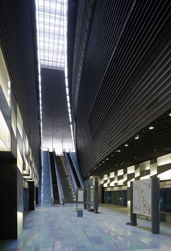 Inspired by landscape forms and the art of Richard Serra, the form of the station is generated both by the flow of crowds down into the station, and inflected by the massive, curved forms of the stadium. The design contrasts a linear element against a curved one. The interior of the station abstracts geological forms, creating a shimmering, glassy grotto below the opaque massive elements above. Pedestrian movement dramatizes perception of the space, as the escalators slide below the curve above, transporting commuters from the concourse at grade to the platform at basement 2.