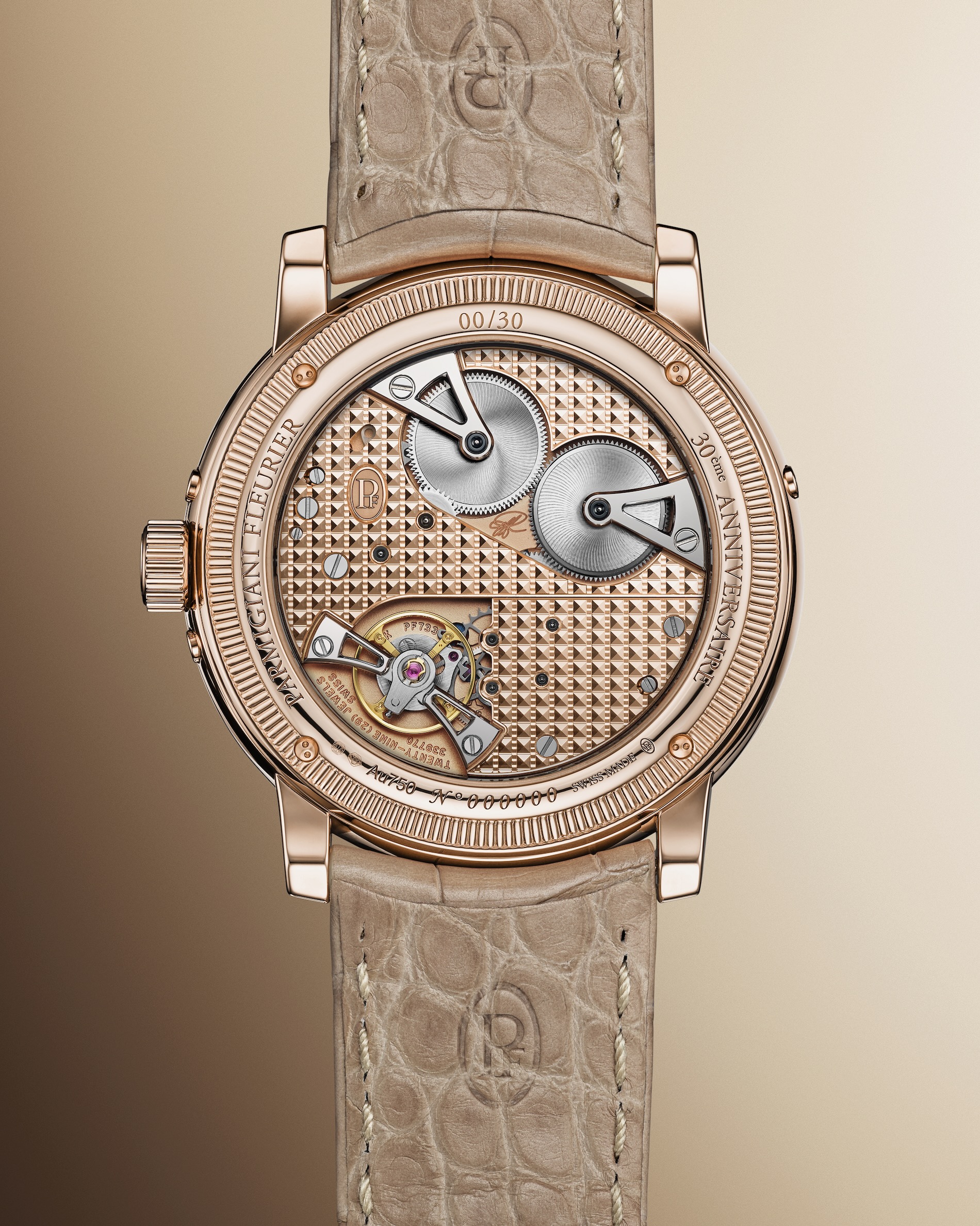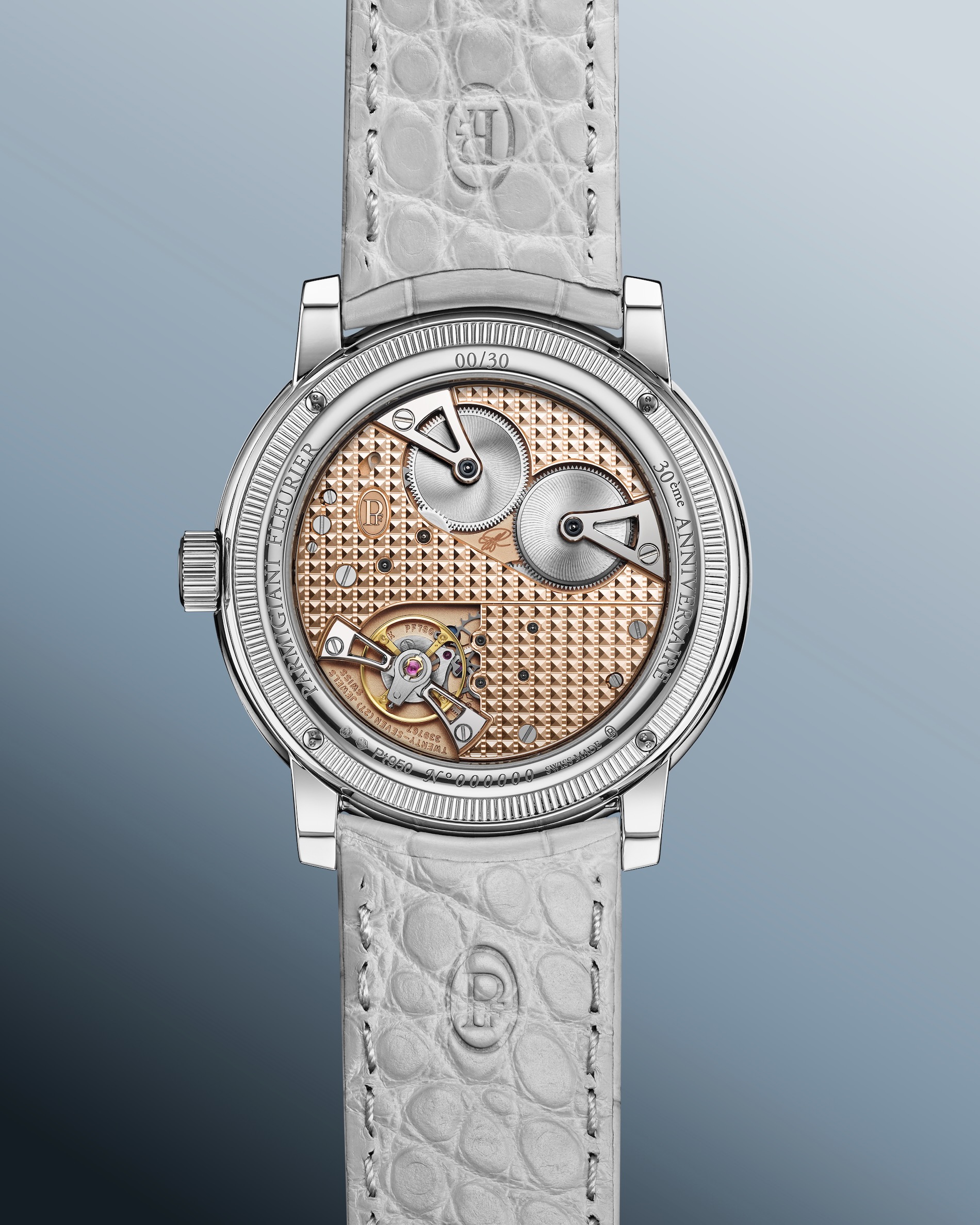 For this anniversary edition, the 18-carat rose gold movement reveals a striking dialogue between polished steel components and warm gold surfaces. The dial, in hand-hammered white gold, appears in Agave Blue and is framed by a platinum case with the signature knurled bezel. The piece is limited to 30 units, individually numbered to mark three decades of living watchmaking.