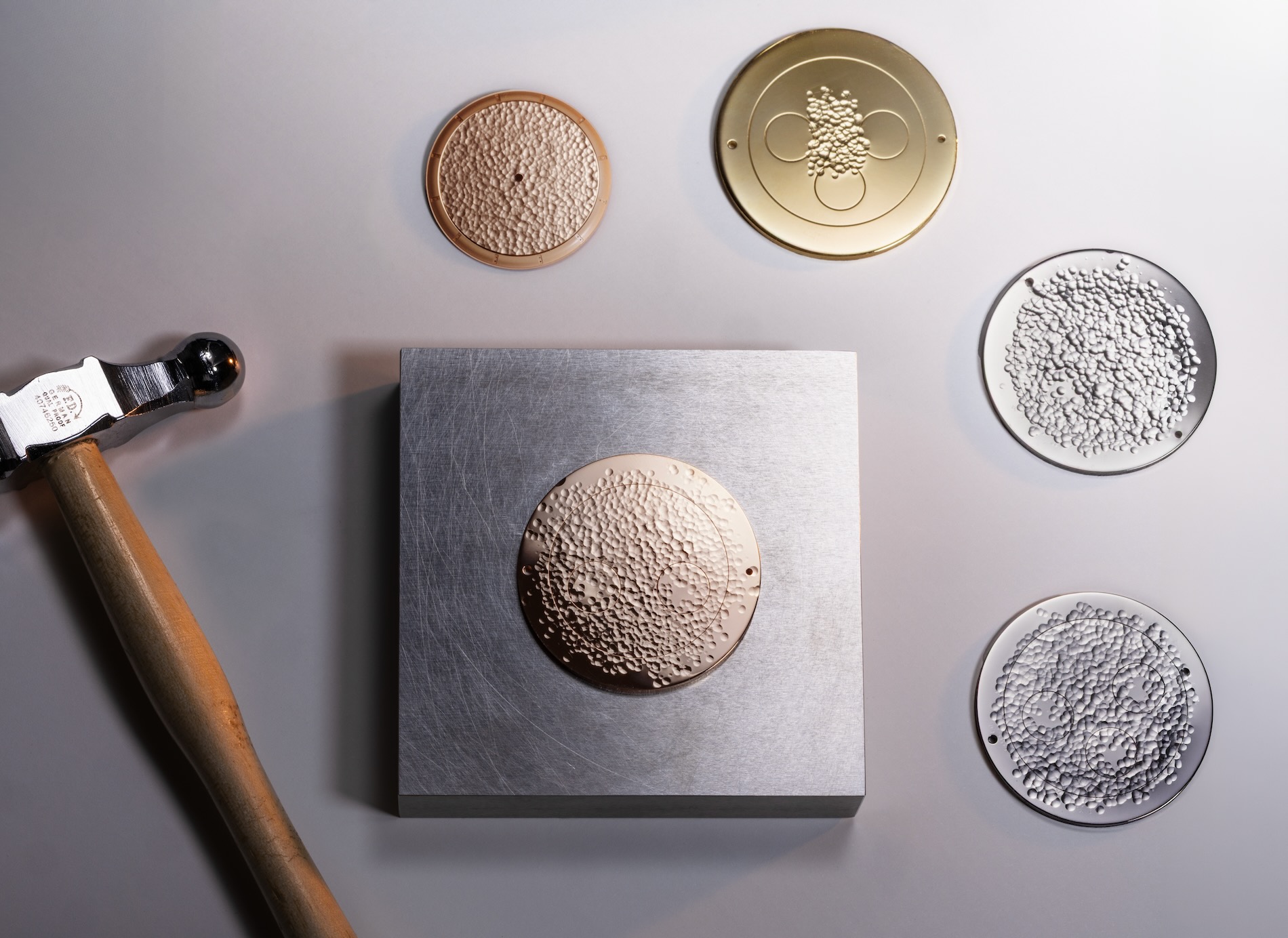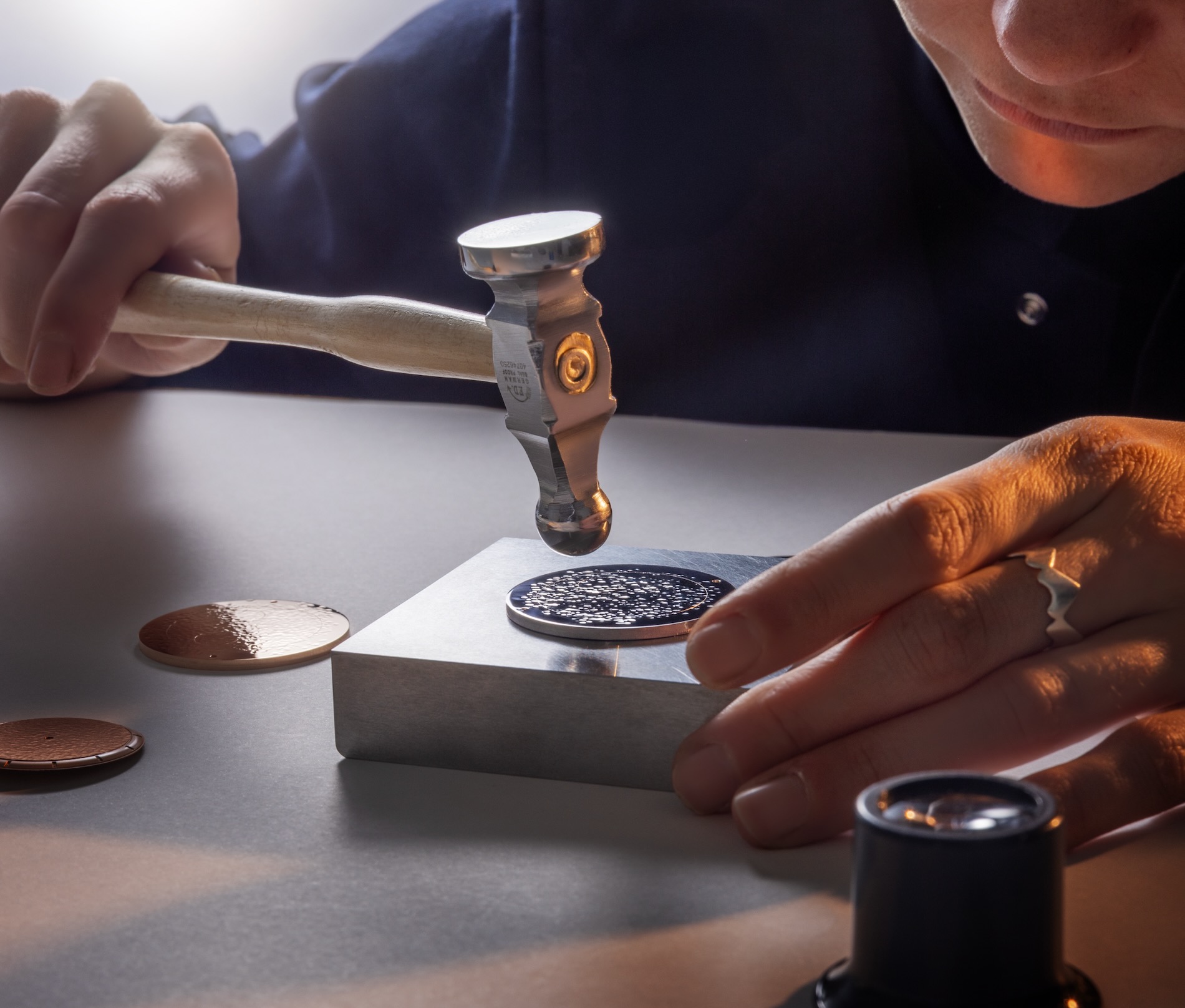 For its 30th anniversary, the Maison introduces a new decorative signature: the hand-hammered gold dial. This technique is rooted in ancient metalworking traditions and requires a single artisan to shape the surface through a succession of precise manual strikes. Because the process is entirely manual, the rhythm, depth, and distribution of impacts vary with each gesture, ensuring that no two dials can ever be identical.