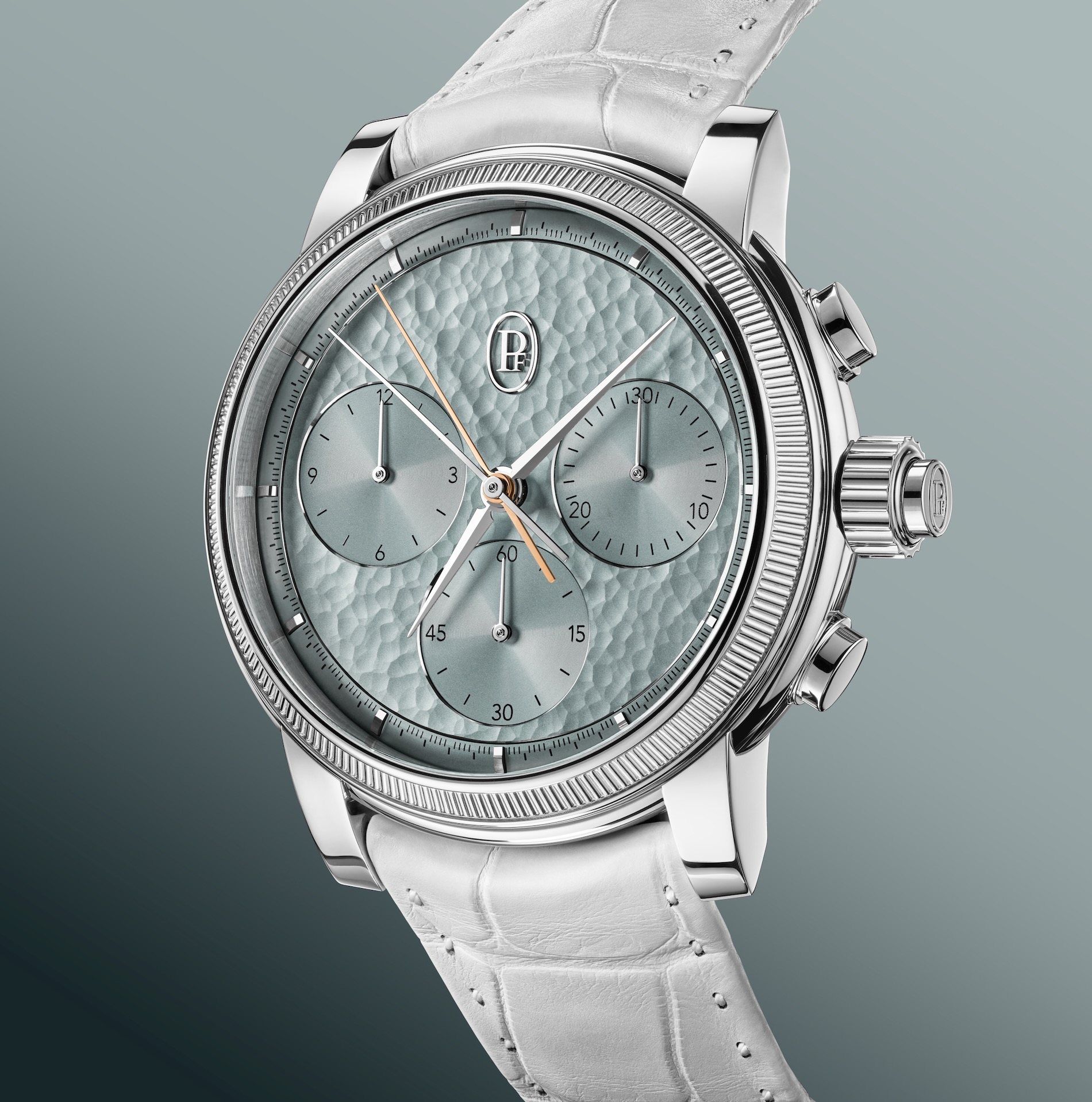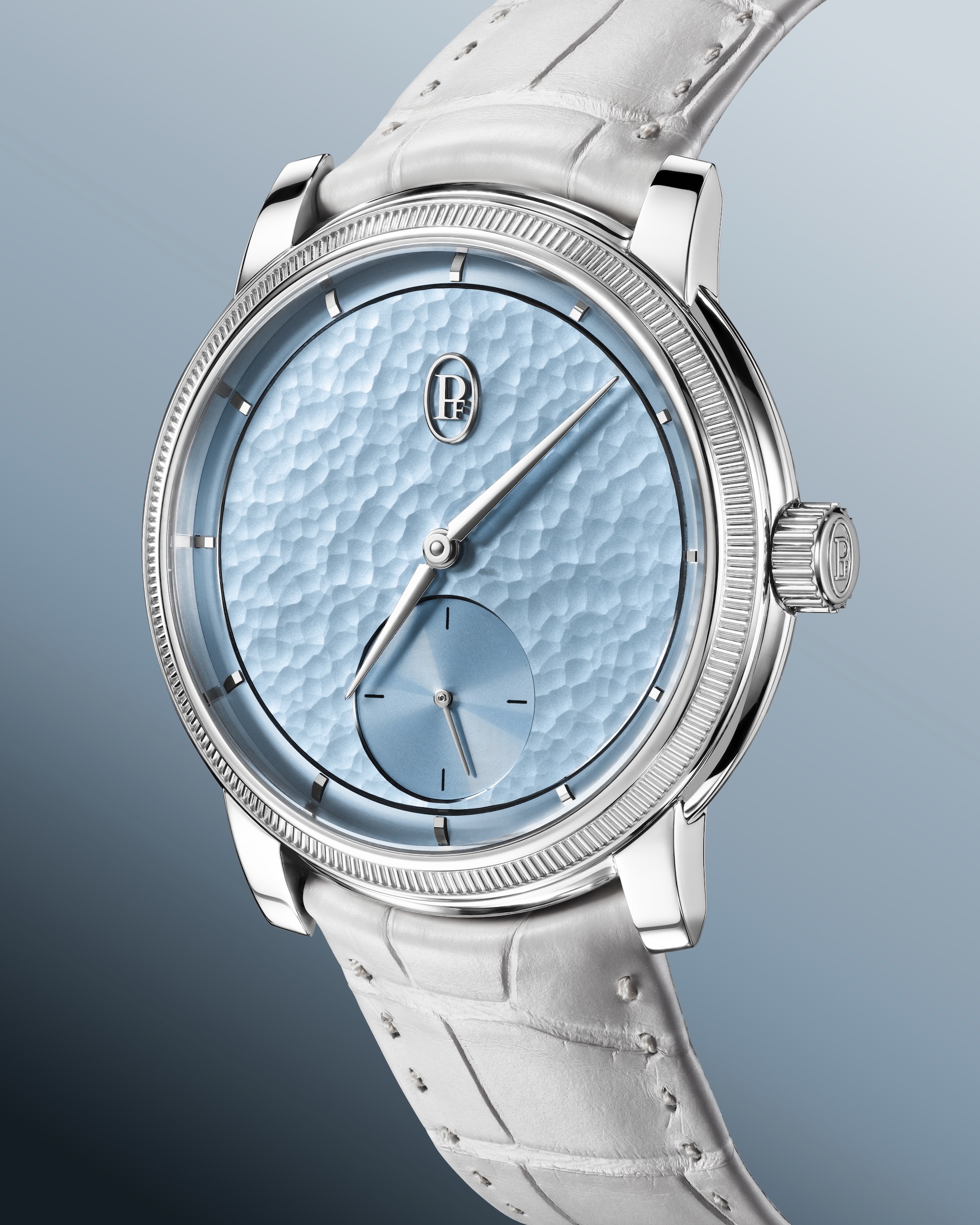 Creating a Parmigiani hammered dial is a demanding process spanning around sixty individual operations. To provide contrast, the counters are finished through a delicate azuré process where fine grooves are cut using diamond tools to capture light with precision.
