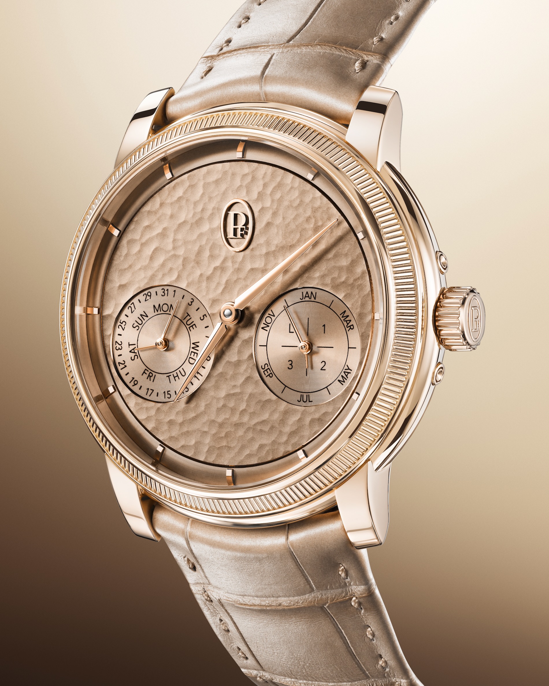 Inside beats the calibre PF733, which reveals rose gold bridges decorated with hand-guilloché Clou de Paris and Filet sauté. Once correctly set and continuously wound, the movement requires correction only once per century. Limited to 30 pieces, the watch balances mechanical intelligence with aesthetic clarity.