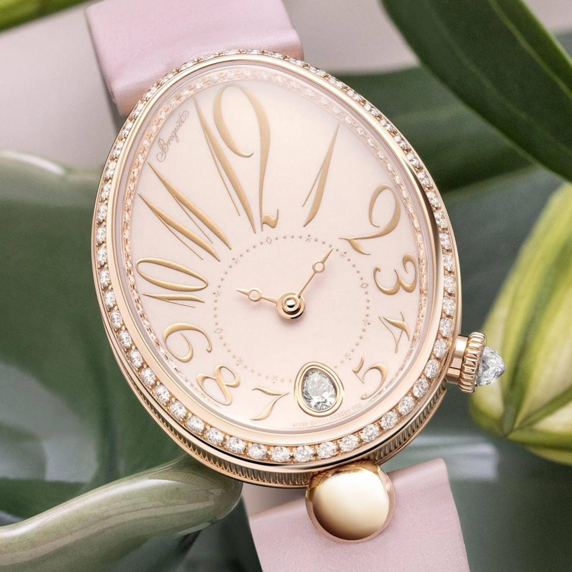After several black and white versions, the Reine de Naples now comes in a pink shade. This new timepiece boasts a feminine and refined visual harmony with its rose gold case, its bezel and flange set with 117 diamonds and its crown, which also features a diamond.