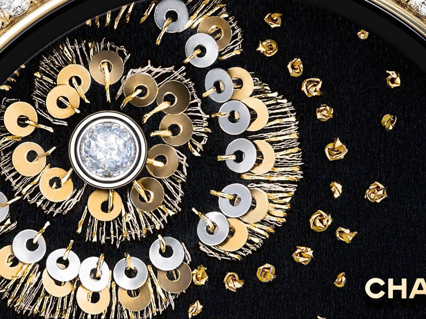 Using the camelia as a recurring motif - the flower was a favourite of Gabrielle Chanel - Maison Lesage created the dials by embroidering a fine fabric using pearls stitched with gold and silk threads, combined with rose-cut diamonds and gold flakes.