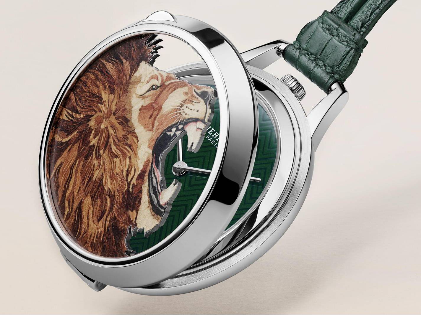 Straight from the savannah, the Hermès Slim d’Hermès Pocket Roaaaaar! features a roaring lion in wood marquetry. The king of the jungle displays his incredible mane on the openworked cover, which reveals a dial in vert cyprès or bleu saphir Grand Feu enamel. Ten precious wood species, including amaranth and tulipwood, were chosen to remain faithful to the original design by British artist Alice Shirley.